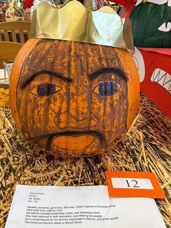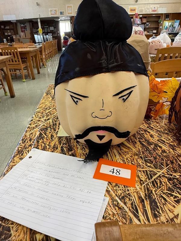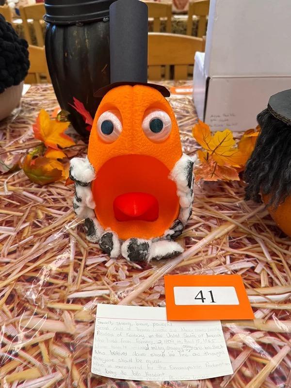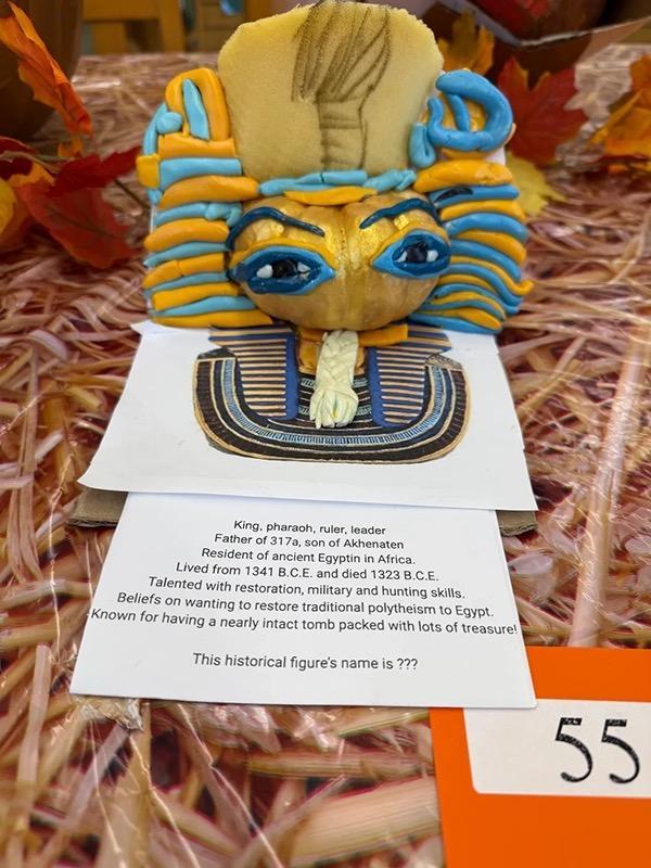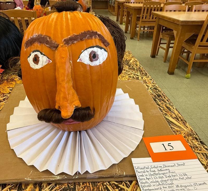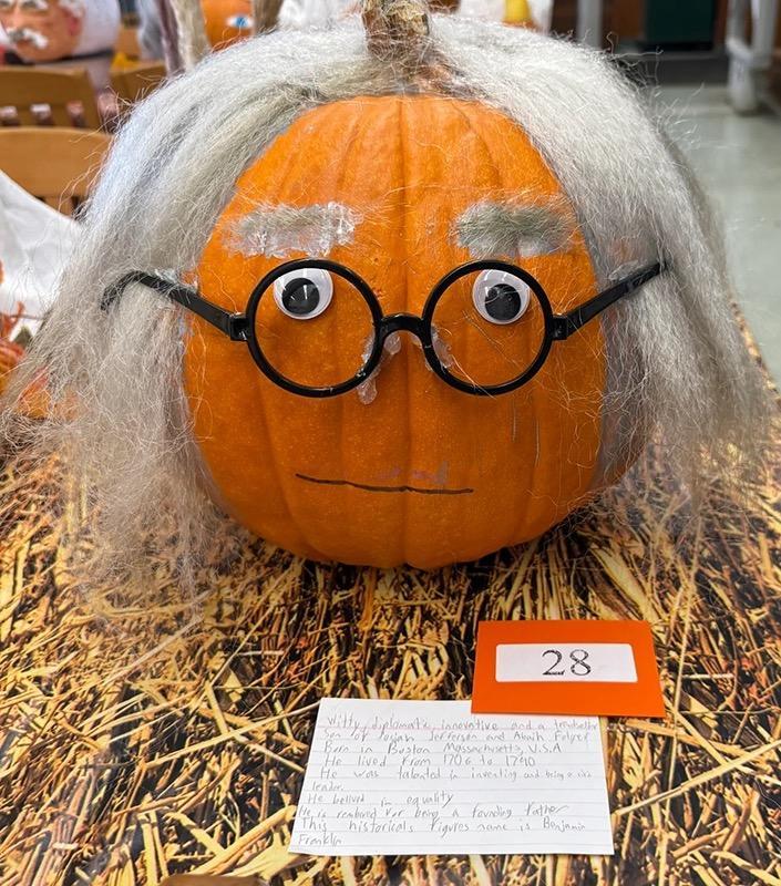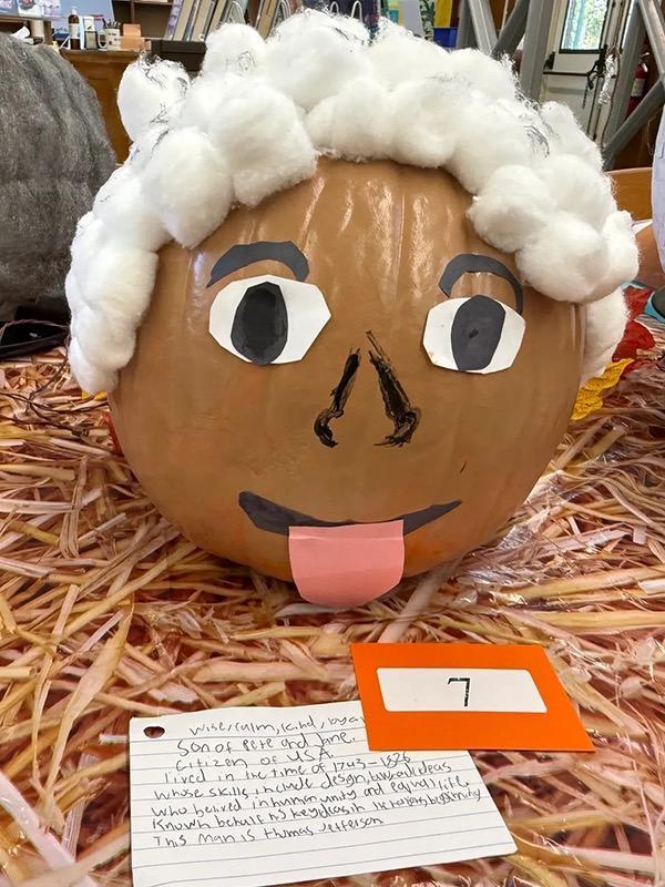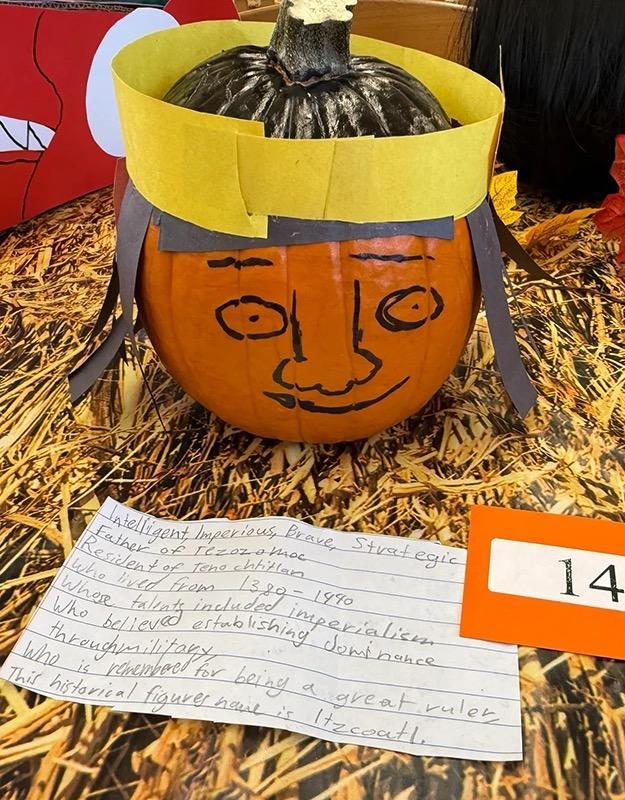 Students bring in a pumpkin that has been decorated to resemble or represent a historical figure such as George Washington or Confucius.