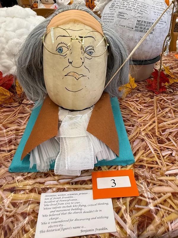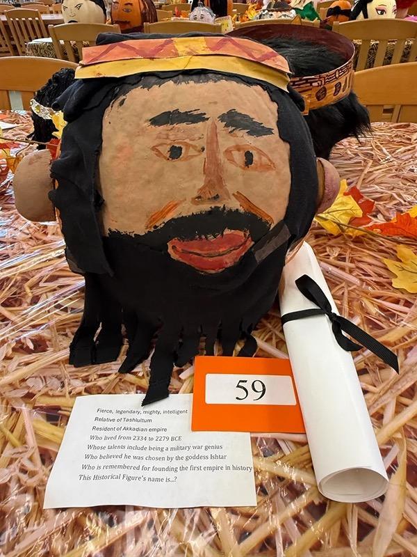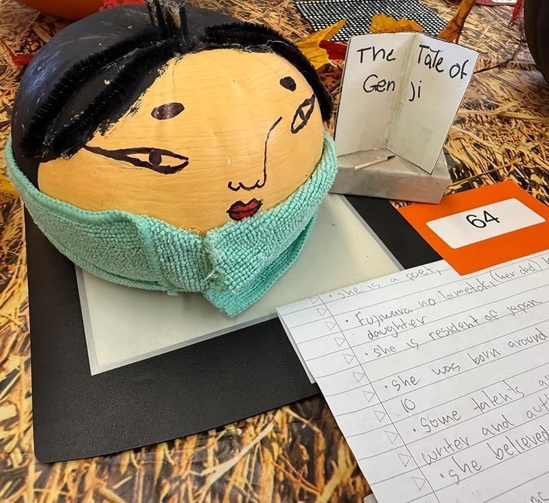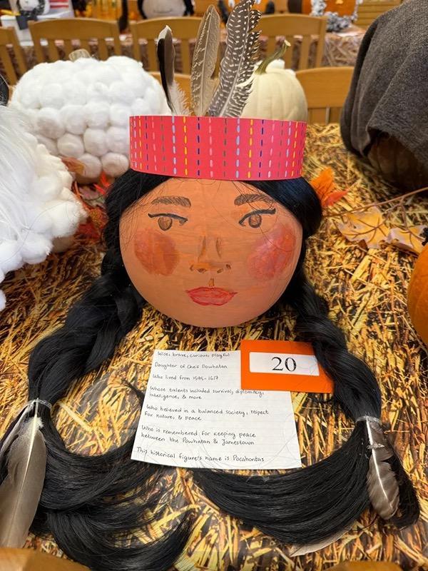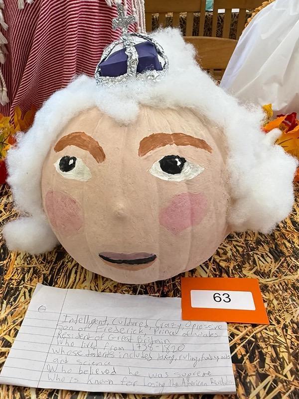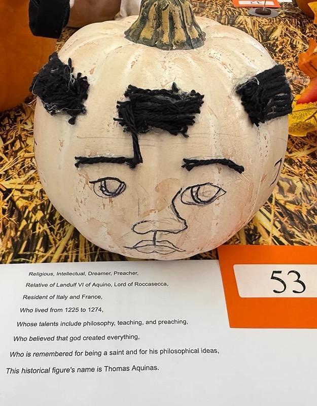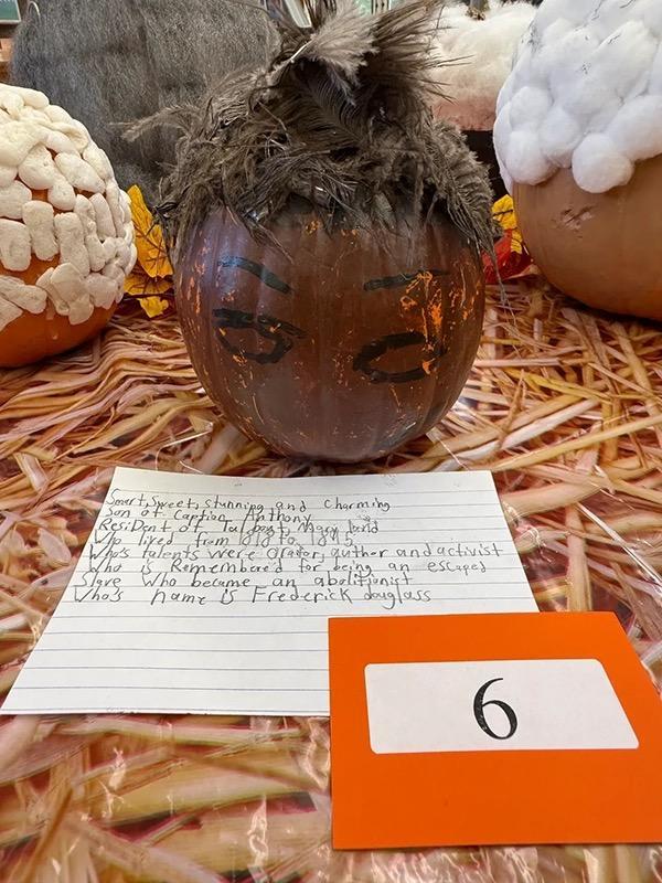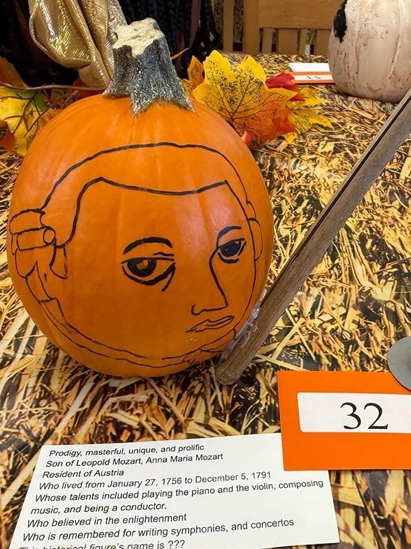Students bring in a pumpkin that has been decorated to resemble or represent a historical figure such as George Washington or Confucius.
